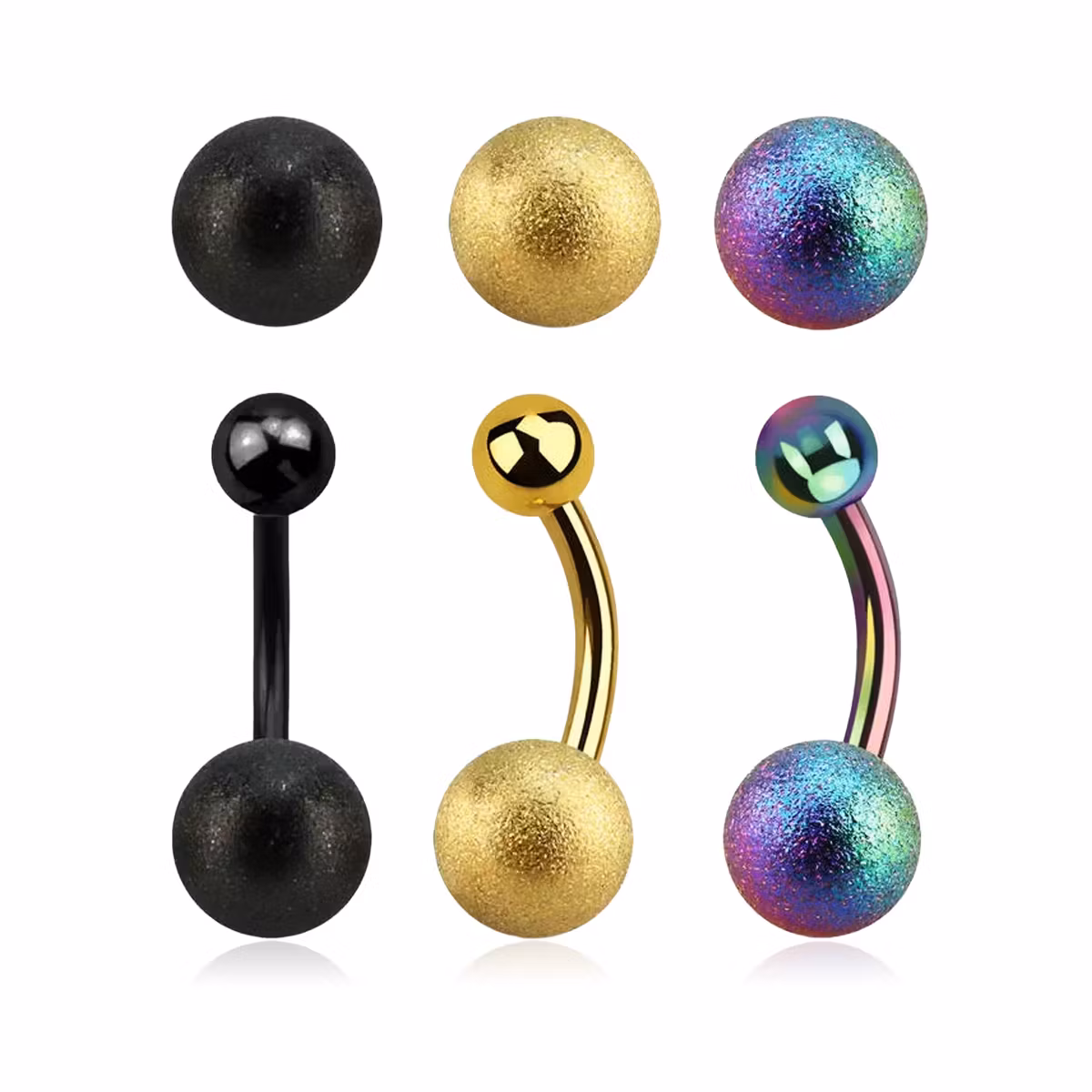 Navelsmycke i PVD-pläterad 316L Kirurgiskt stål. 14gauge - 1.6mm med 5mm slät kula och 8mm frostad kula. Utvändigt gängad. Längden mäts rakt över, utan kula och gänga.