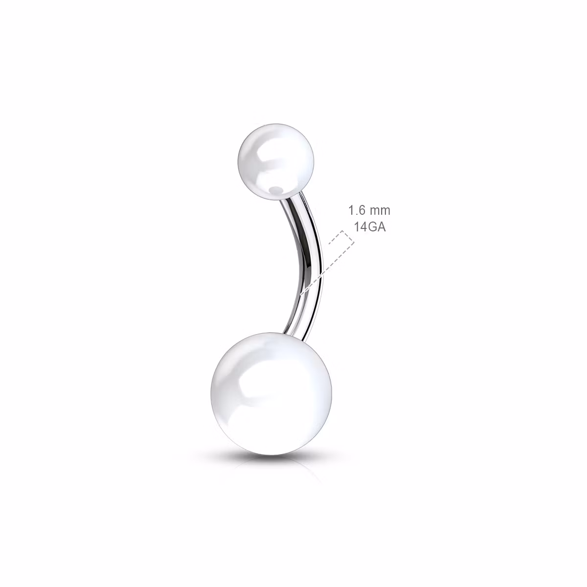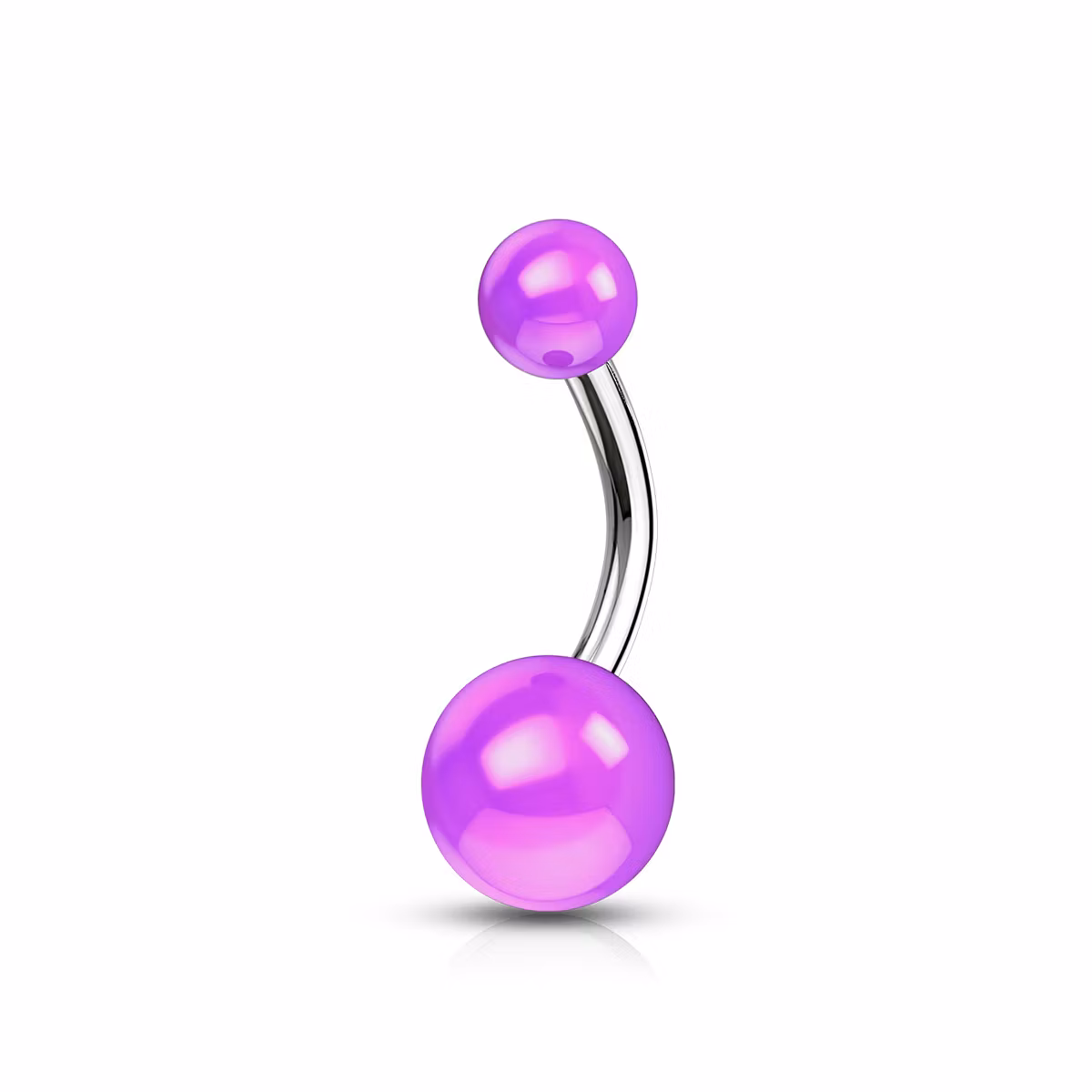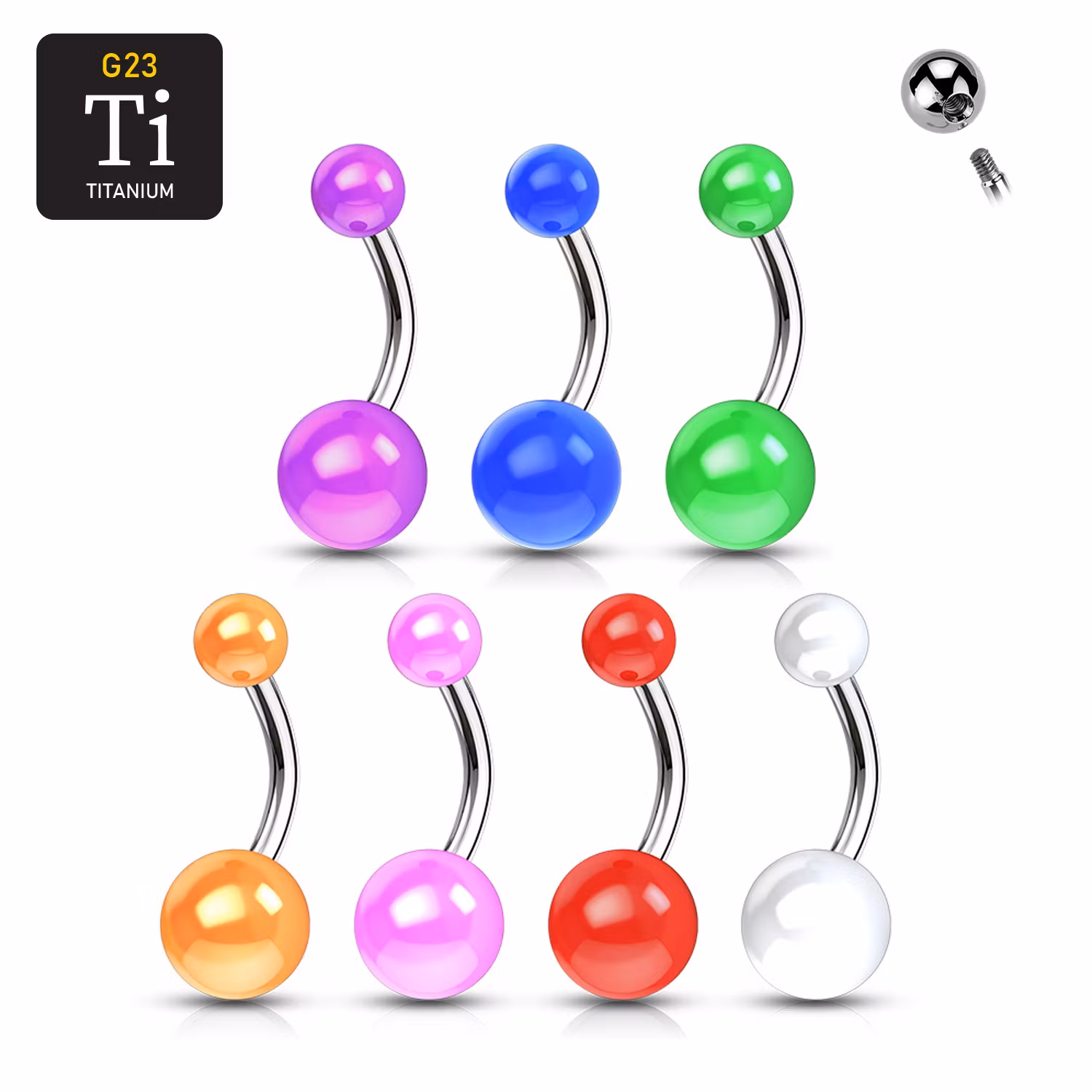Navelsmycke / Banana i ASTM-F136 Grade 23 titan. 14gauge - 1.6mm. 10mm lång. Utvändigt gängad. 5mm och 8mm akrylkulor.
