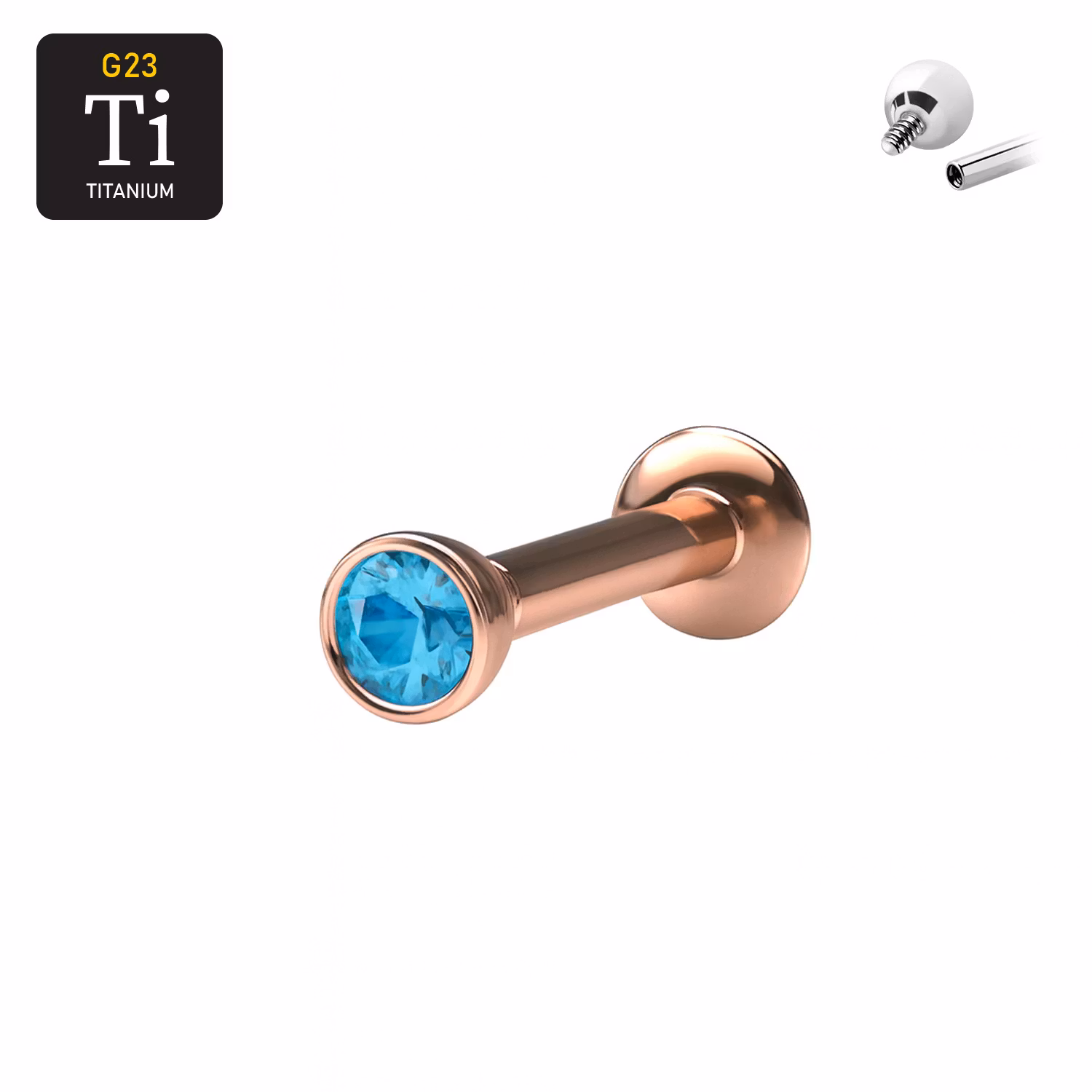 Labret i ASTM F136 G23 titanium. PVD-pläterad roséguld. Invändigt gängad. 14gauge - 1.6mm. 4mm bas. 3mm topp med aquamarine cubic zirconia.