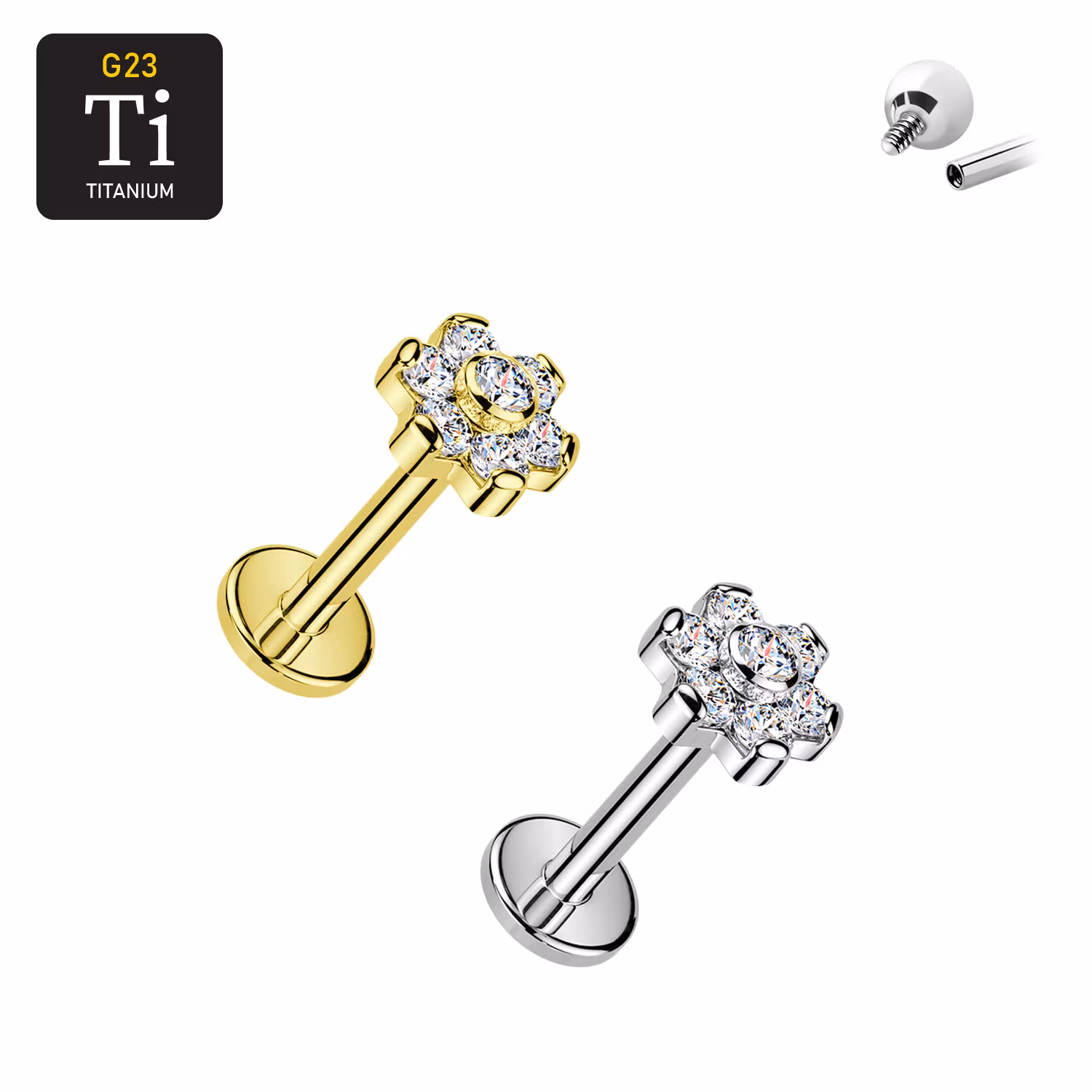Titanium labret 1.2mm invändigt gängad - Blomma med 7 CZ