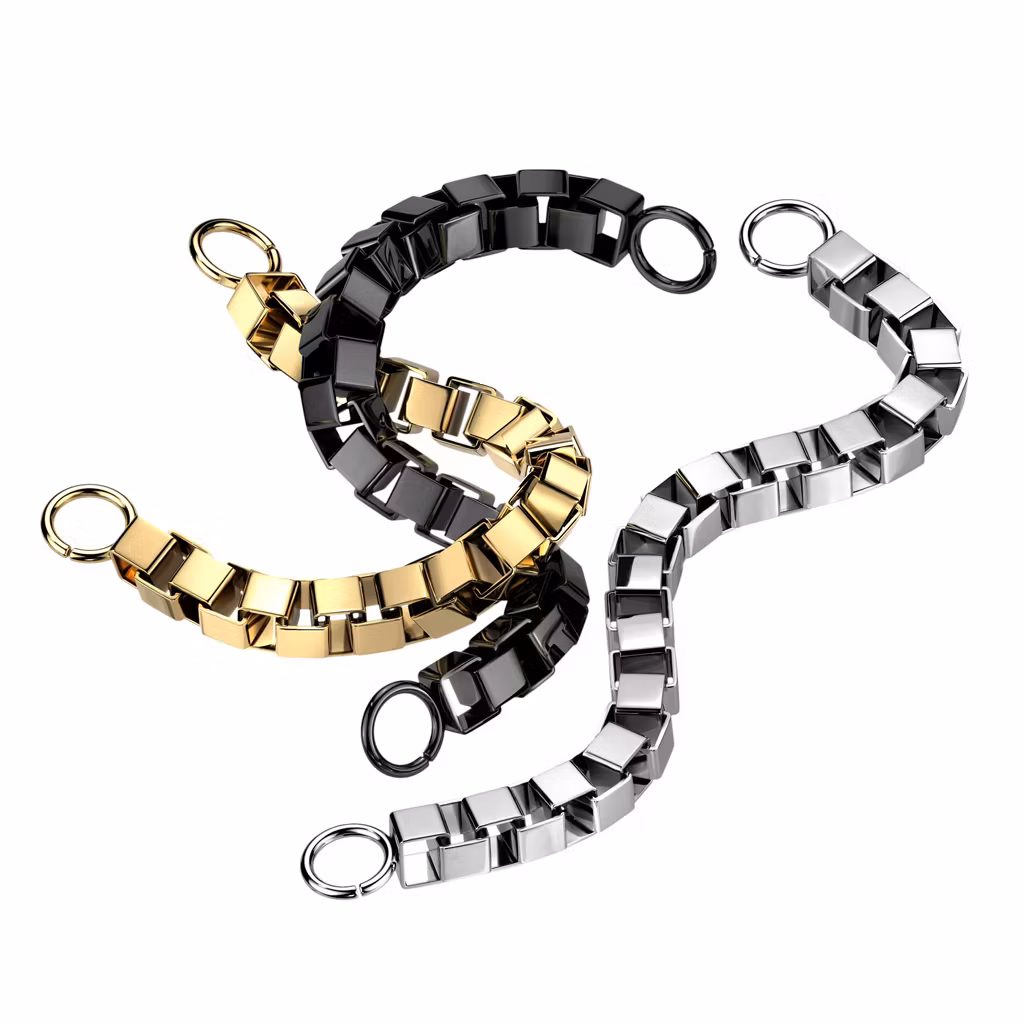 Boxkedja i 316L kirurgiskt stål. De färgade varianterna är PVD-pläterade. Länken är 2 x 2mm. Välj längd och färg innan den kan läggas i varukorgen.