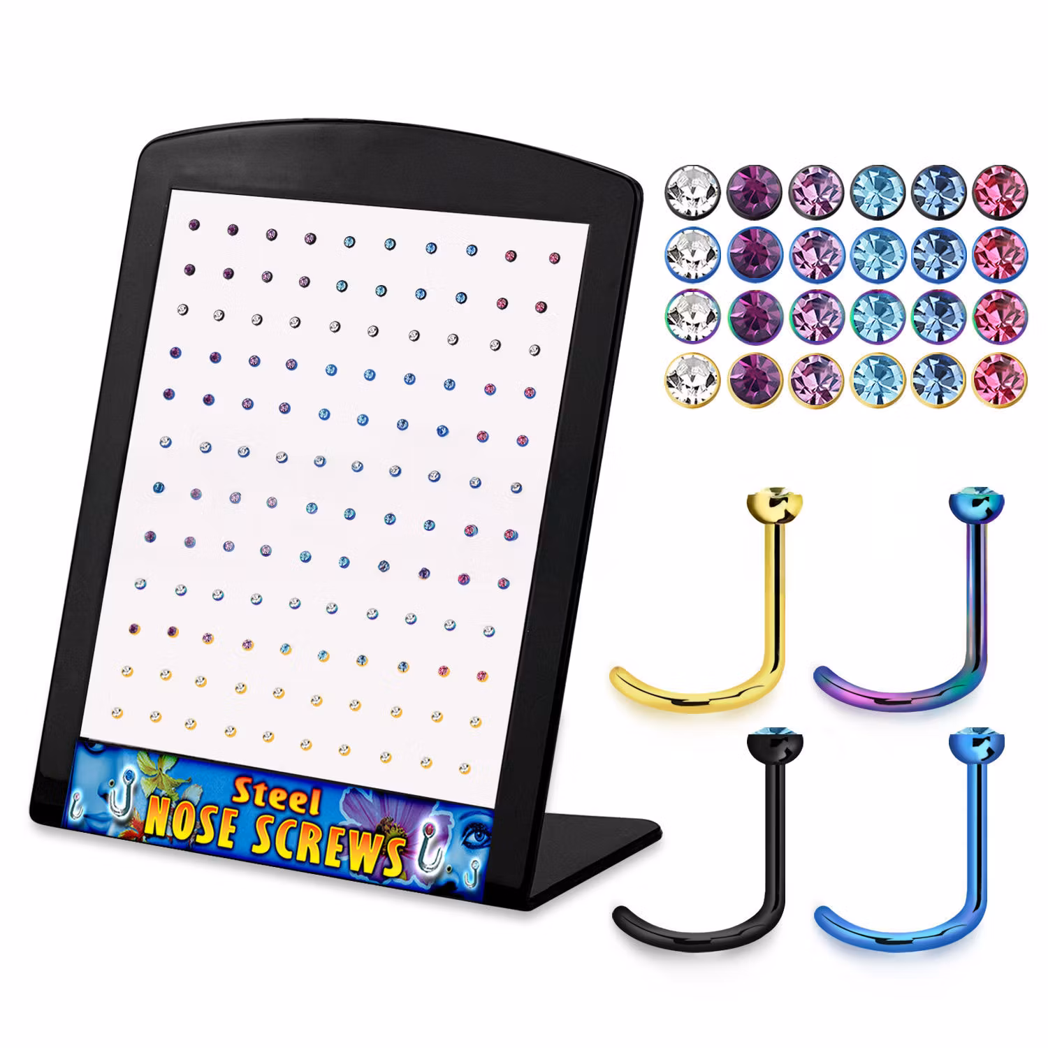 Display med 120st nässmycken i PVD-pläterad kirurgiskt stål med crystal