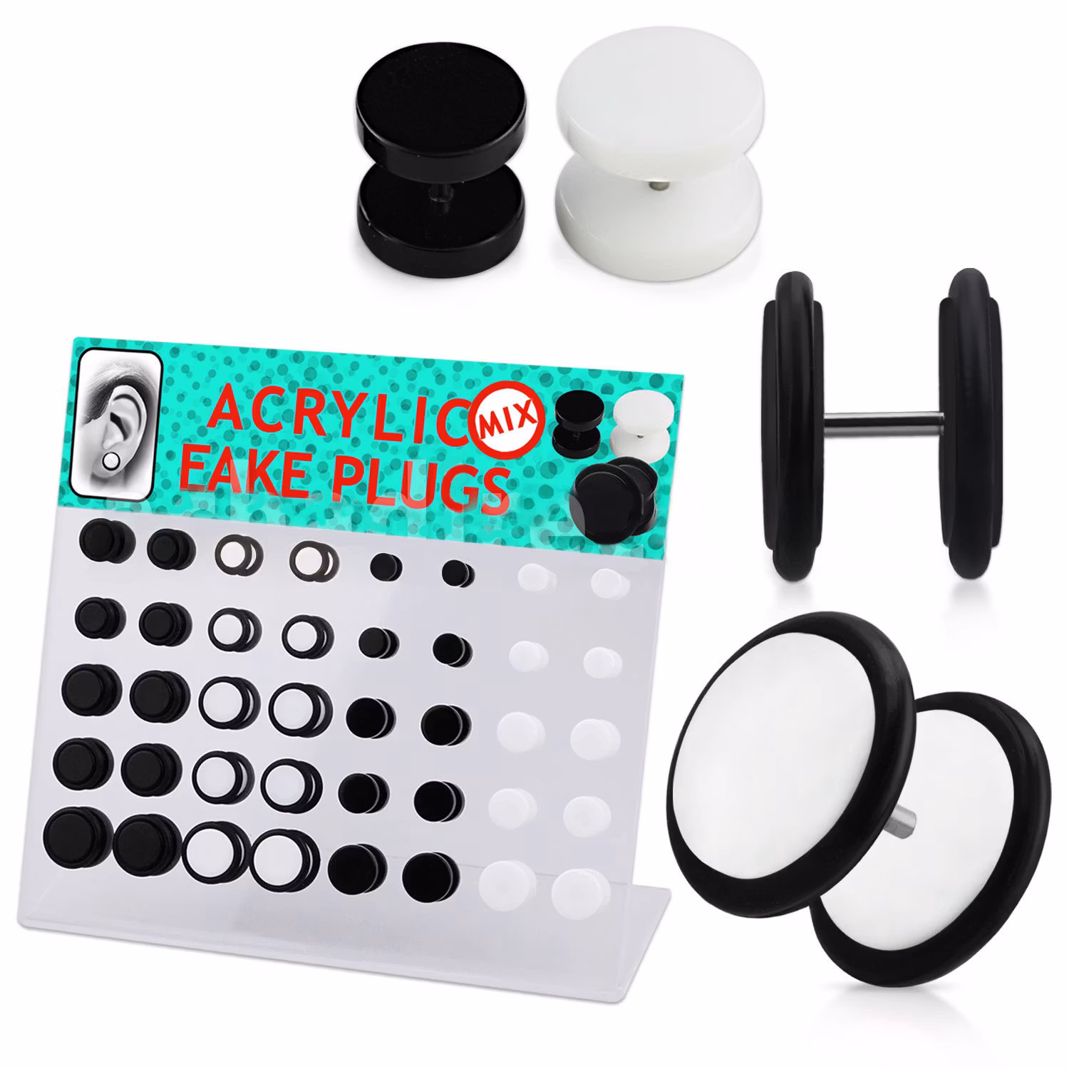 Display med 40st fakepluggar i akryl / kirurgiskt stål