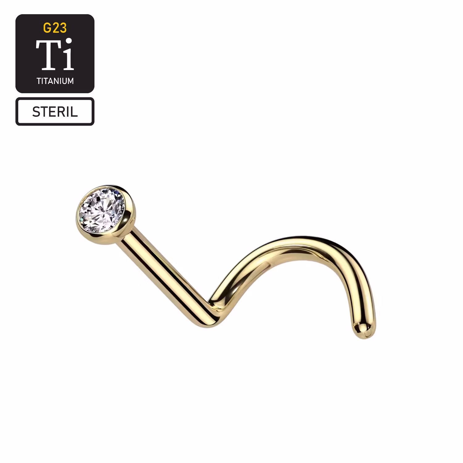 Näspiercing / Nässkruv i PVD-pläterad ASTM-F136 Titanium. 20gauge - 0.8mm eller 18gauge - 1.0mm. Topp med cubic zirconia. 6mm lång mellan toppen och böjen.