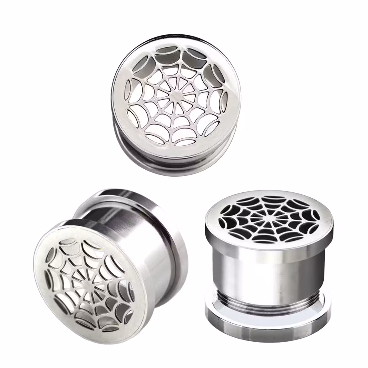Ståltunnel med laserskuret spindelnät. Högglanspolerad 316L Kirurgiskt stål. Ring med gänga i bakkant som håller tunneln på plats.