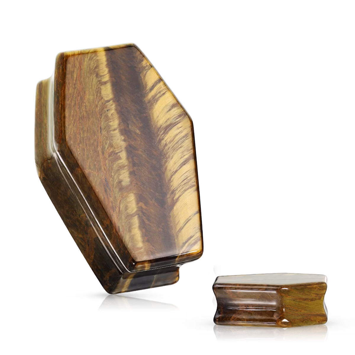 Double Flare stenplugg i polerad tigeröga sten. Något höjda kanter håller den på plats. Då pluggen tillverkas av organiskt råmaterial så är varje plugg unik.