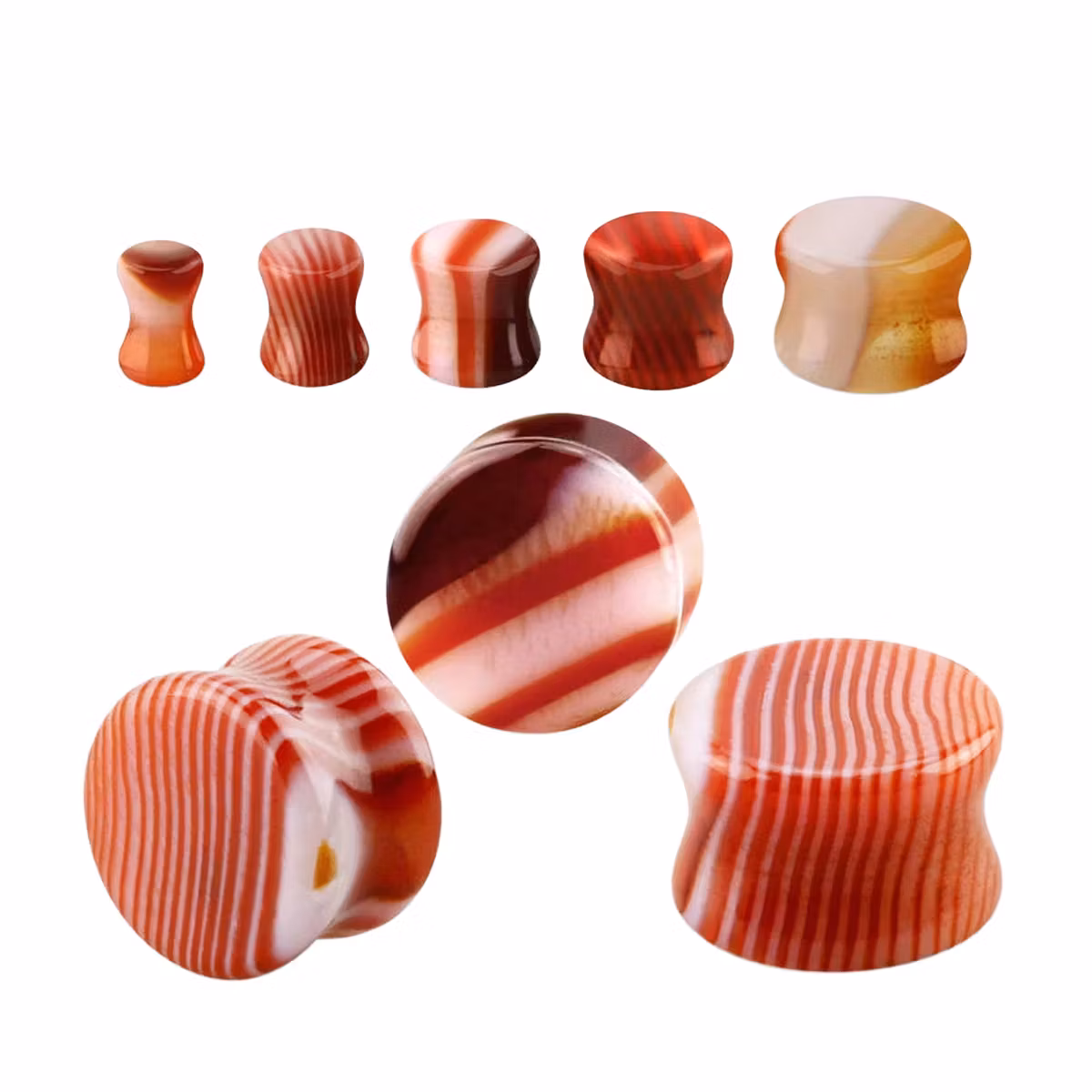 Stenplugg i naturligt röd agat. Varje plugg är unik då den tillverkas direkt från organiskt råmaterial.