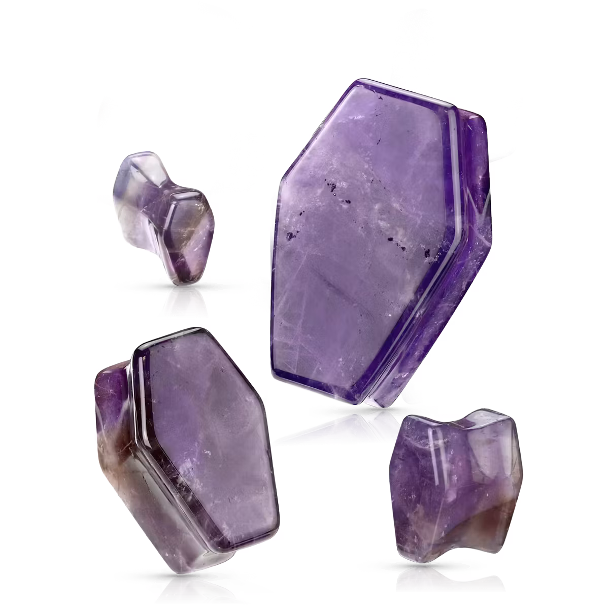 Double Flare stenplugg i polerad ametist. Något höjda kanter håller den på plats. Då pluggen tillverkas av organiskt råmaterial så är varje plugg unik.