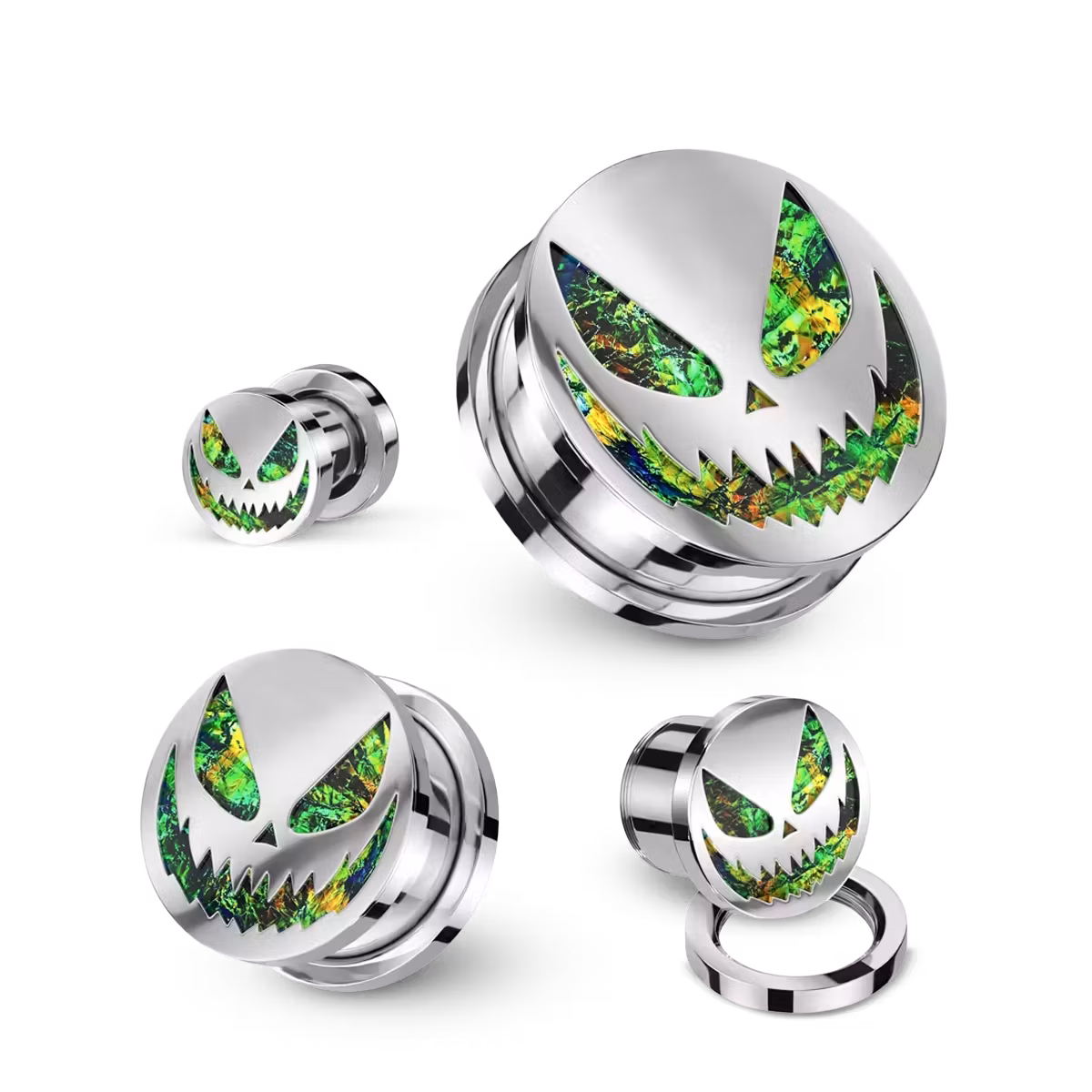 Ståltunnel / plugg med grön glitteropal (syntetisk opal) bakom halloween smile.