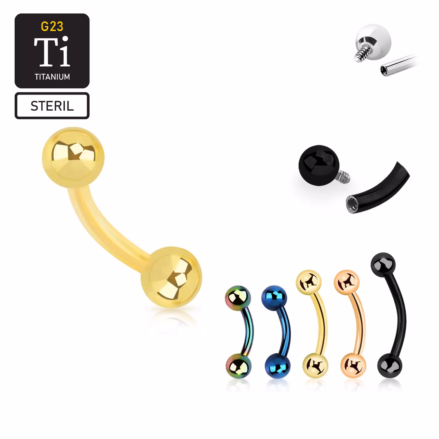 Banana i ASTM-F136 G23 Titan. Invändigt gängad stav. 16gauge - 1.2mm. 3mm kulor. PVD-pläterad. EO-gas steriliserad.