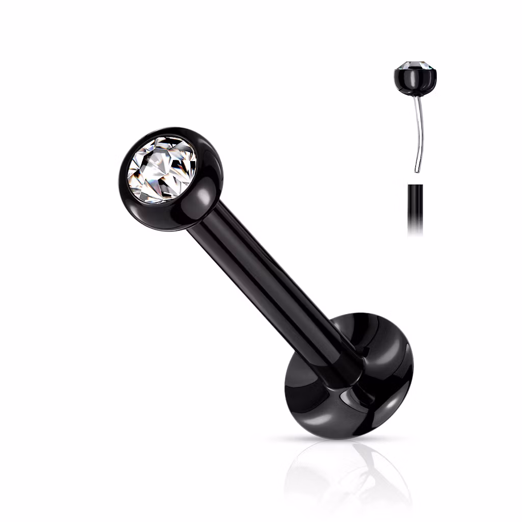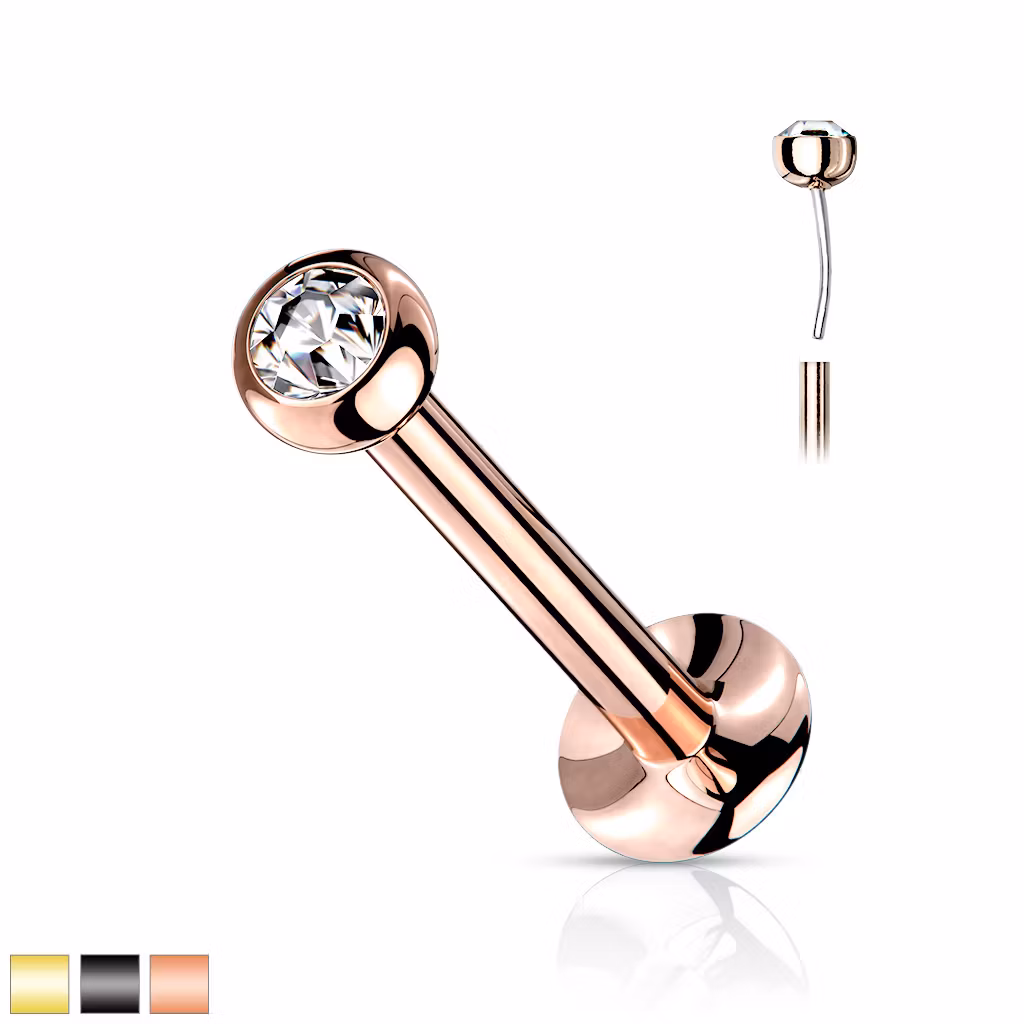 Labret med 2mm push-pin kula med crystal. Alla delar tillverkade i PVD-pläterad 316L kirurgiskt stål. 3mm konvex bas. 20 gauge - 0.8mm. Passar bland annat näsvinge, öron och piercing i läpp.