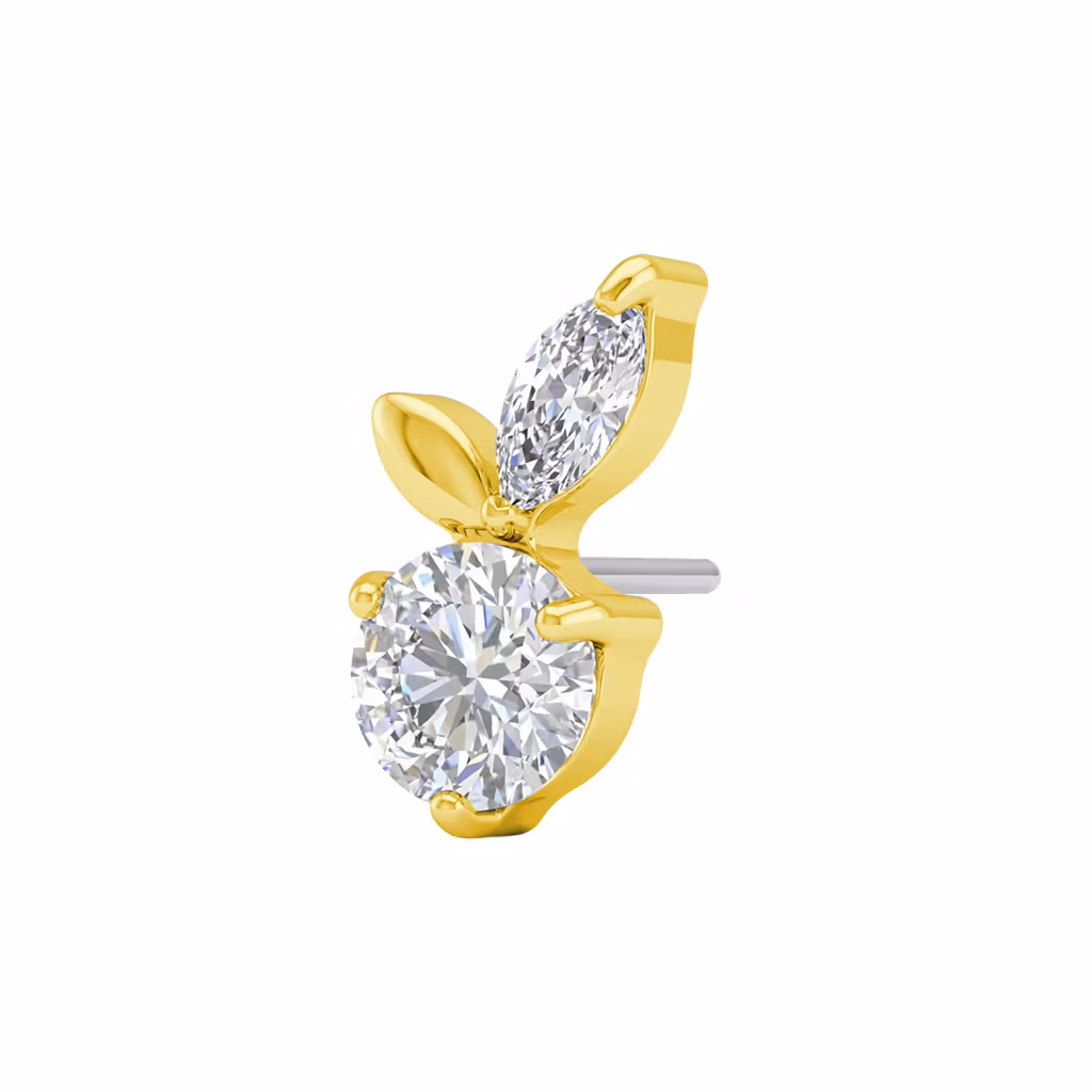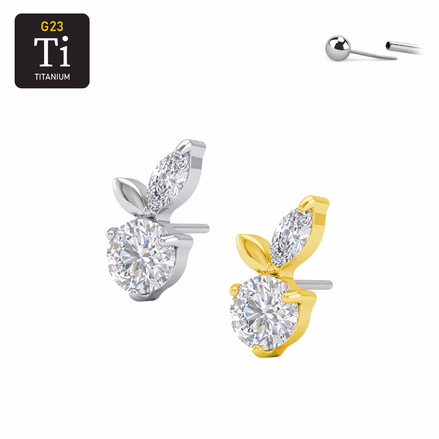 Threadless topp i Titanium. Den färgade varianten är PVD-pläterad. Format som ett bär med rund cz samt löv i navettslipad cz.