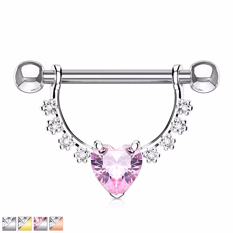 Barbell i 316L Kirurgiskt stål. De färgade varianterna är PVD-pläterade. Hänge i pläterad 302L mässing med hjärtformad cubic zirconia centrerad i nedre delen av smycket.