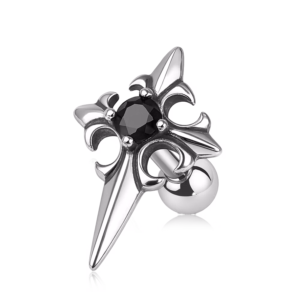 Tragus barbell 16gauge - 1.2mm. 6mm lång med 4mm kula. Medeltida kors ca 10x15mm med svart cubic zirconia.