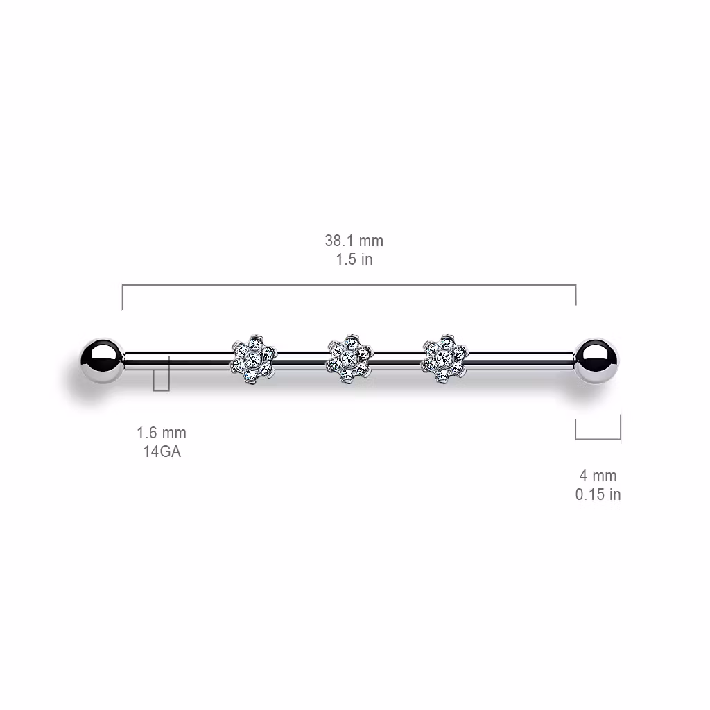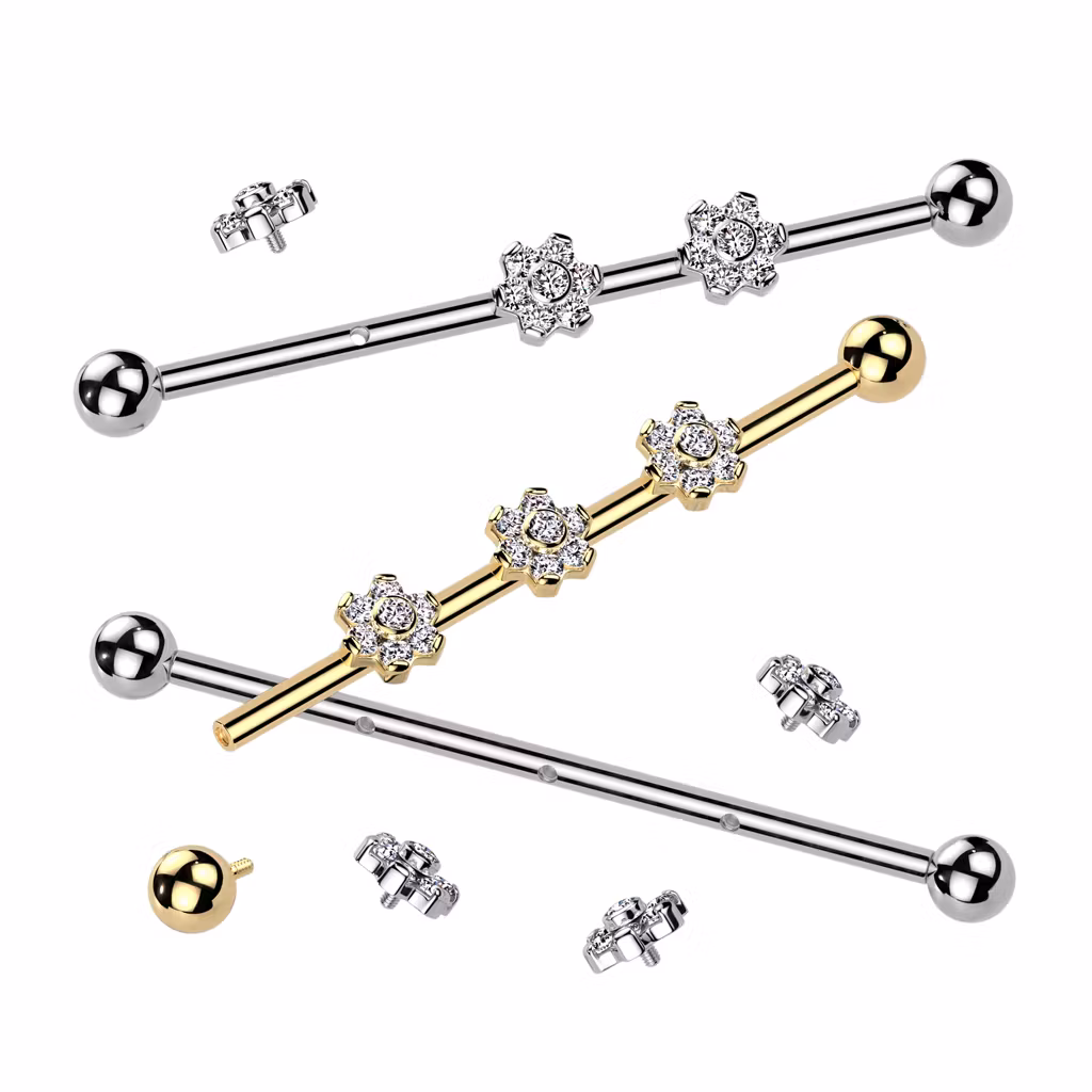 Industrial barbell i ASTM-F136 G23 Titanium. Invändigt gängad med 4mm kulor i vardera ände samt tre blommor med klar cubic zirconia. Den guldfärgade varianten är PVD-pläterad.