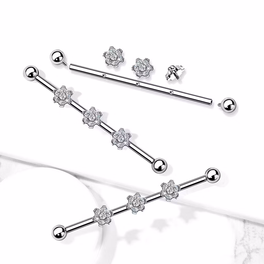 Titanium industrial barbell 1.6mm med 3st blommor med cubic zirconia
