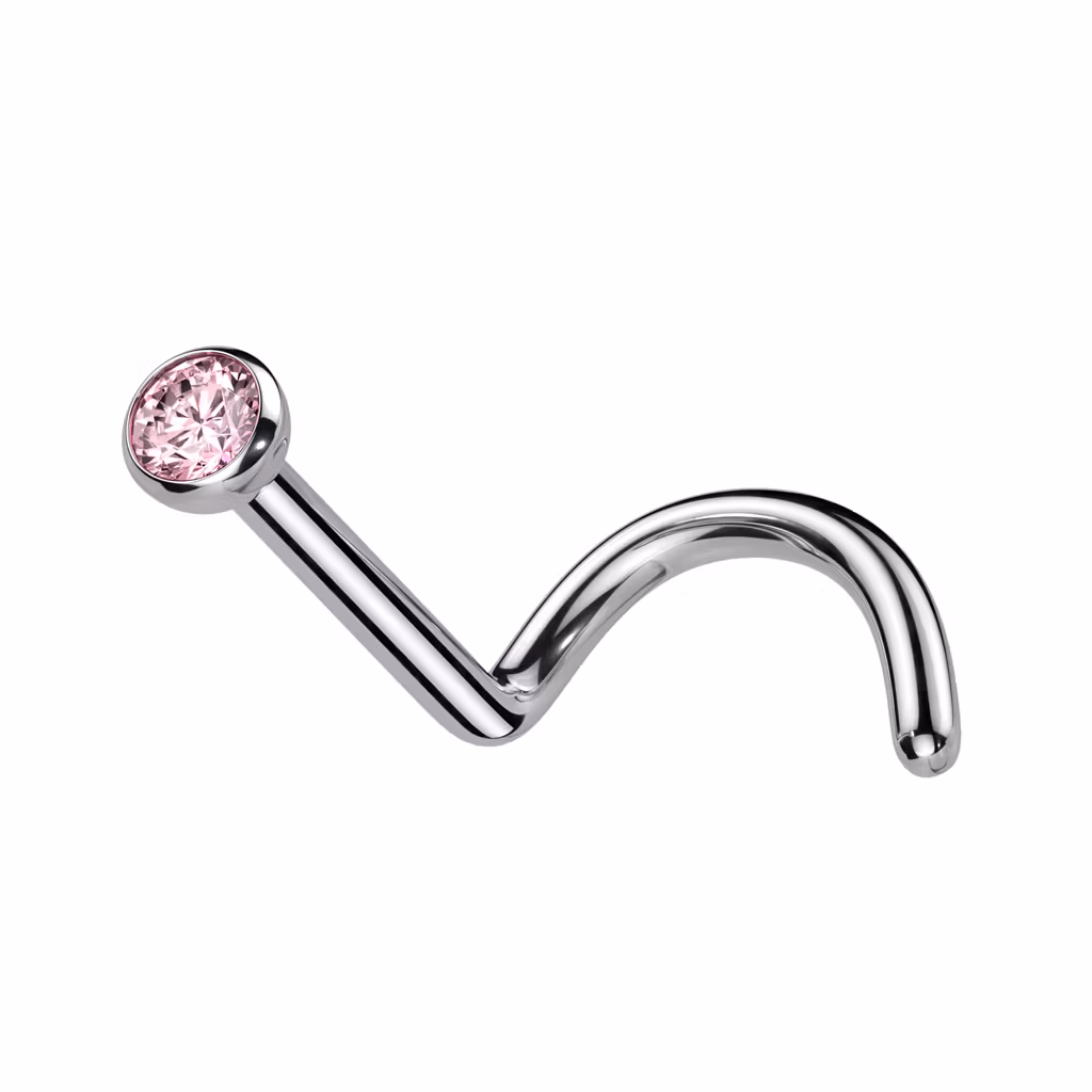 Näspiercing / Nässkruv i ASTM-F136 Titanium. 20gauge - 0.8mm eller 18gauge - 1.0mm. Topp med cubic zirconia. 6mm lång mellan toppen och böjen.