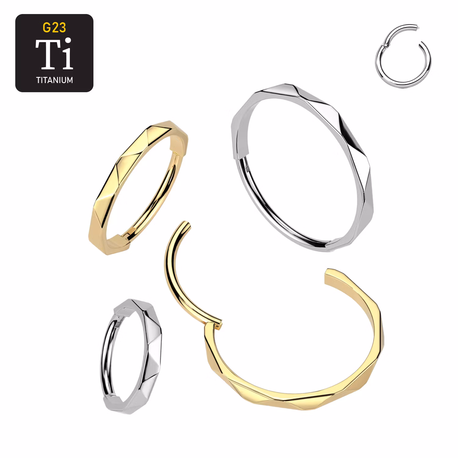 Ring i ASTM-F136 G23 Titan. Den färgade varianten är PVD-pläterad. Gångjärn för enklare hantering.