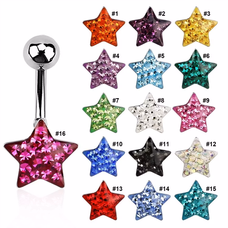 Navelsmycke i 316L Kirurgiskt stål. 14gauge - 1.6mm. 10mm lång. 5mm kula och stjärnformad platta med ferido limmade stenar