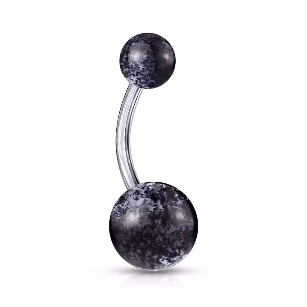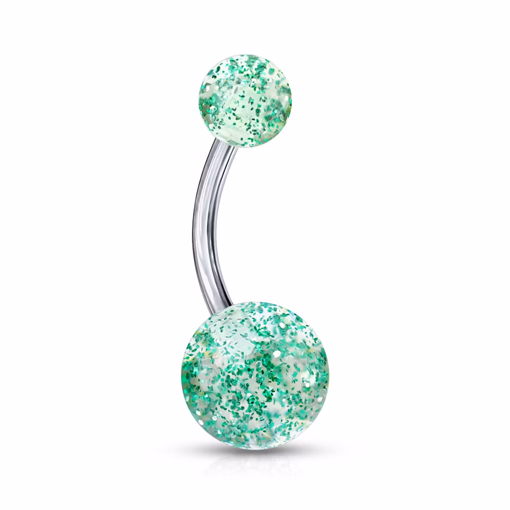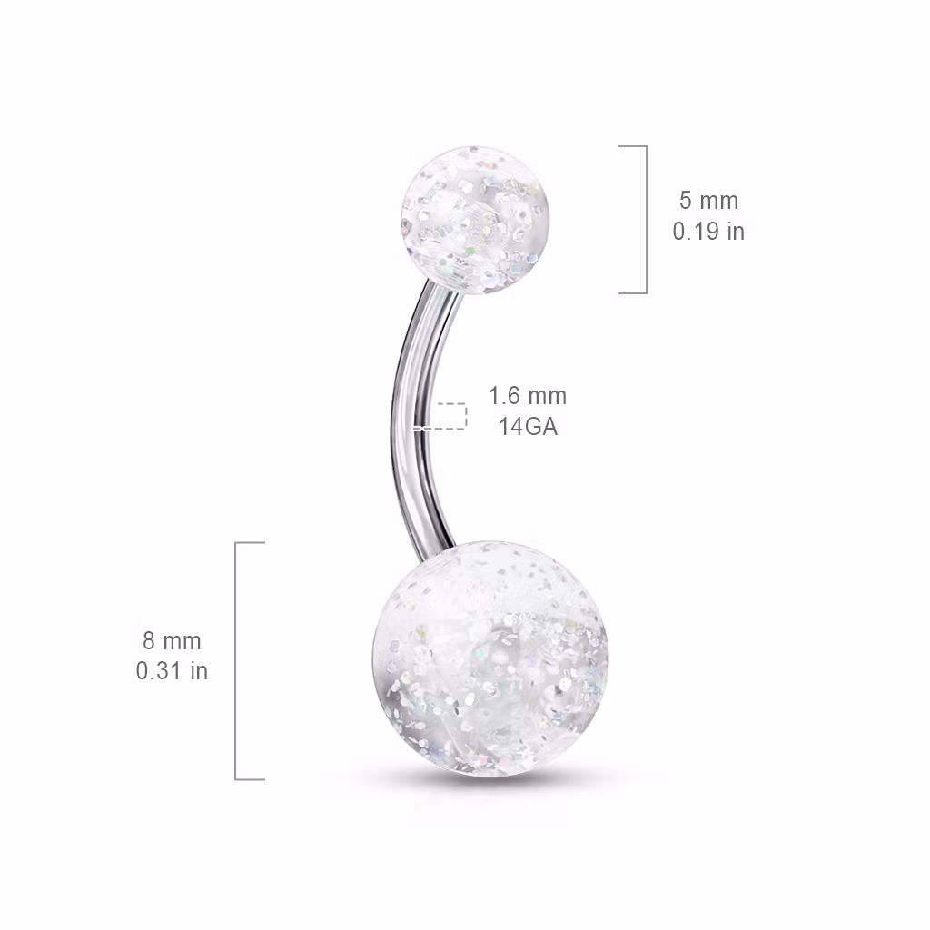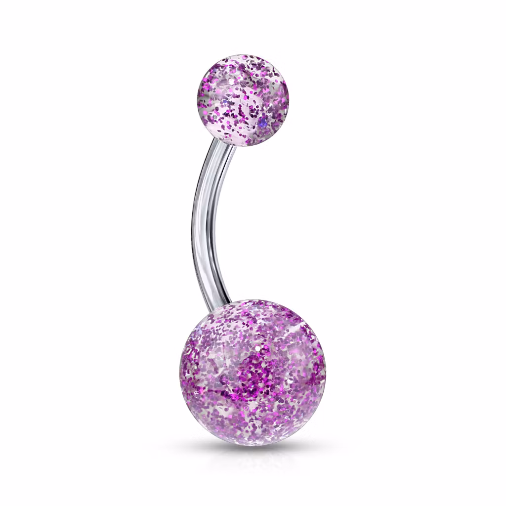 Navelsmycke / banana i 316L kirurgiskt stål. 14gauge - 1.6mm. 10mm lång. Akrylkulor med glitter 5mm och 8mm stora.