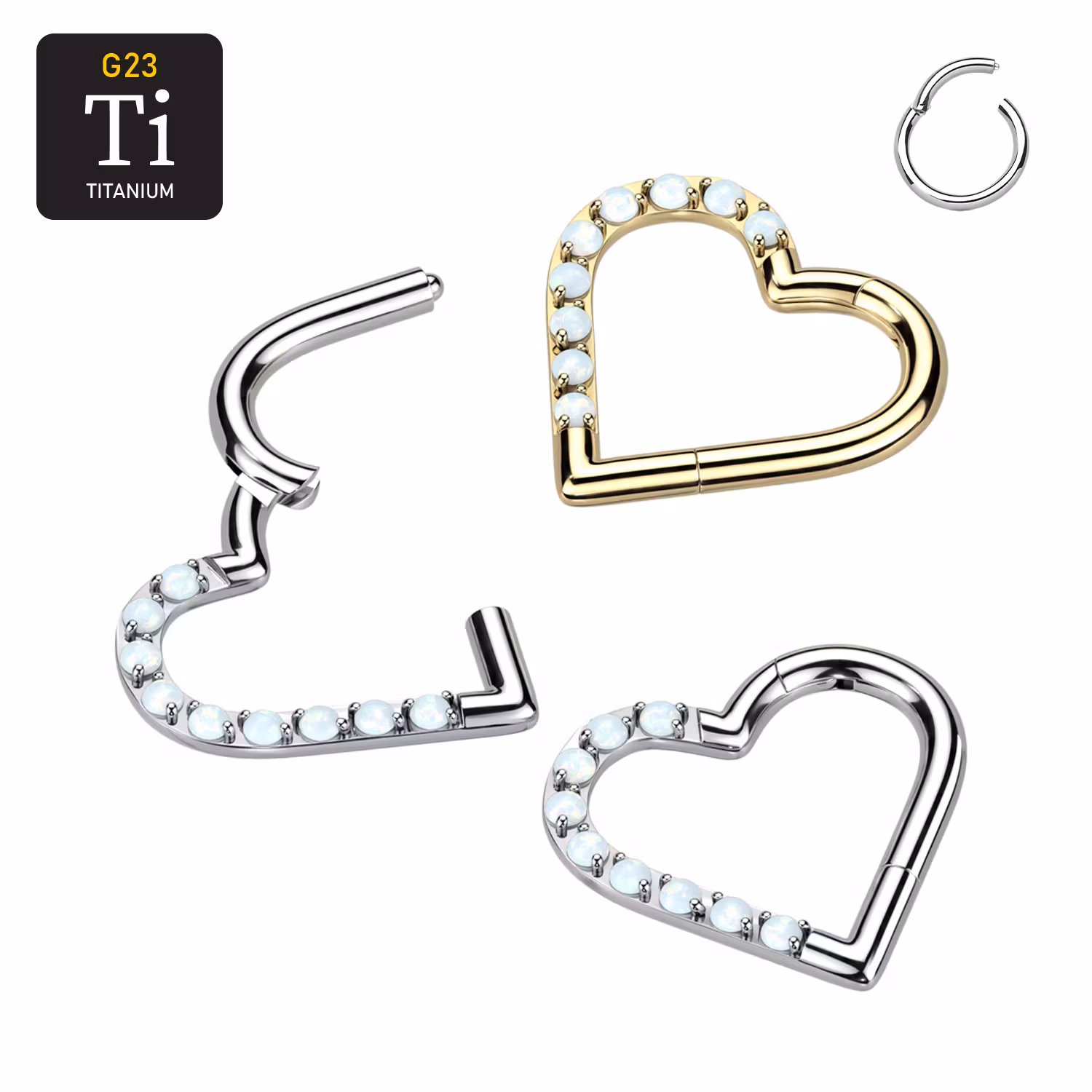 Hjärtformad ring med gångjärn. Allt tillverkat i ASTM-F136 titanium. Den färgade varianten är PVD-pläterad.