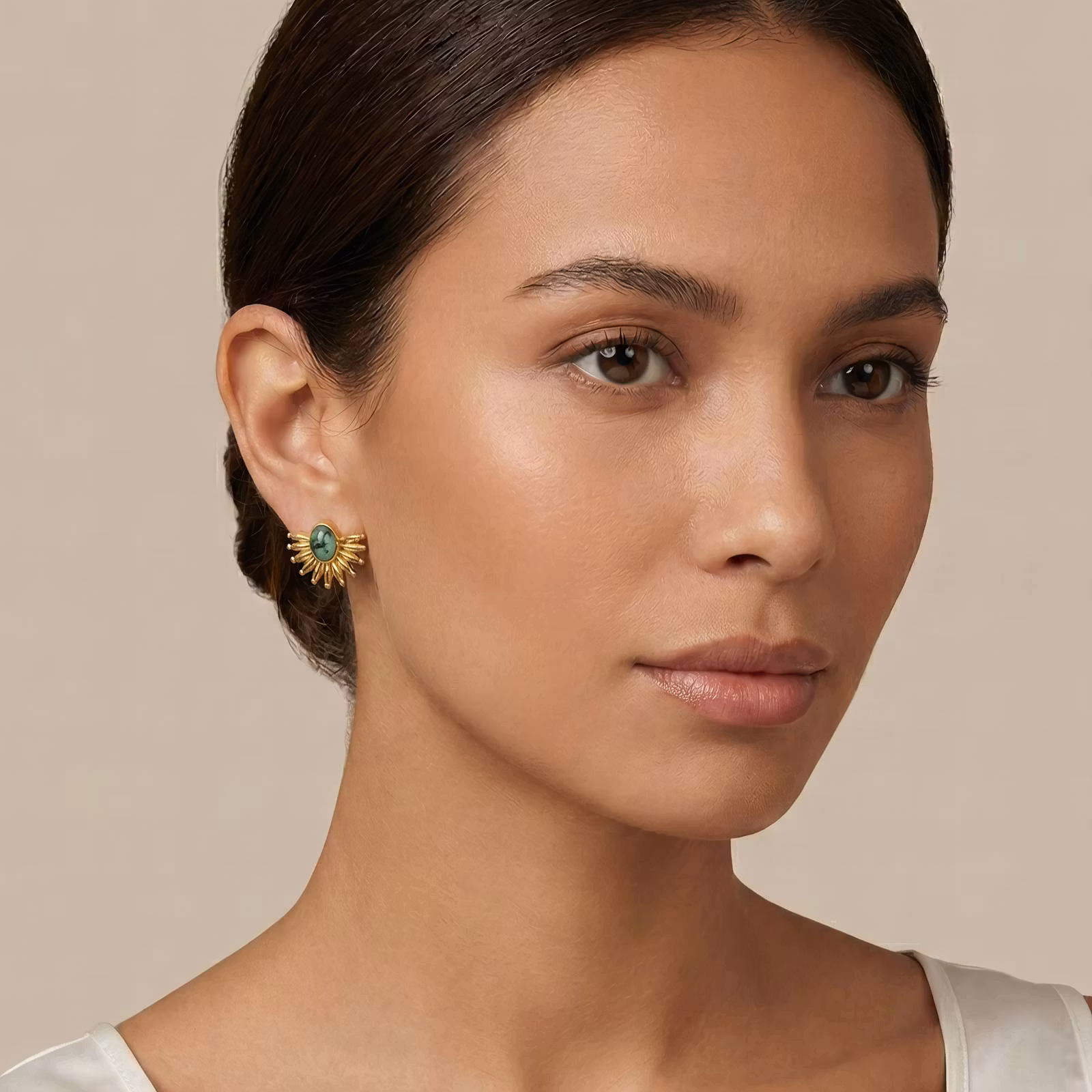 Örhänge i 316L kirurgiskt stål med 18 karat guldplätering. Solfjäder med grön melerad natursten. Storlek på hela hänget ungefär 1.5 x 1.2 cm.